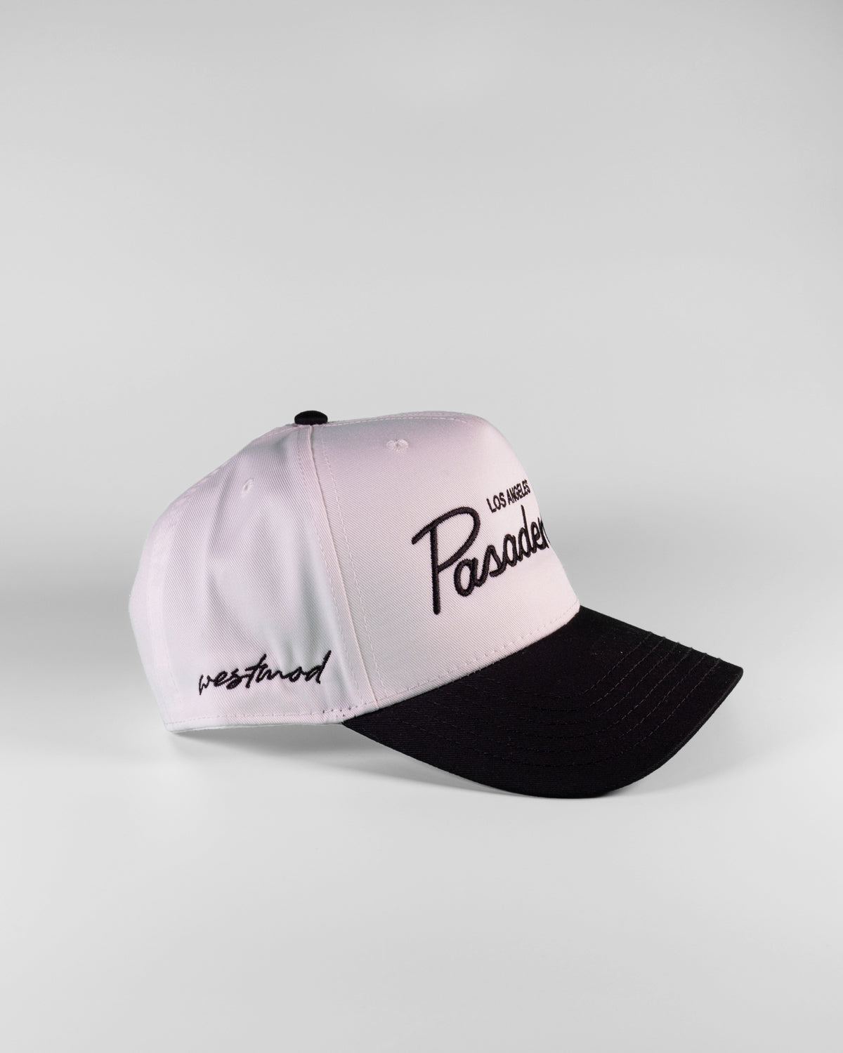 Two-tone white and black 5-panel pro style cap featuring black custom embroidery.